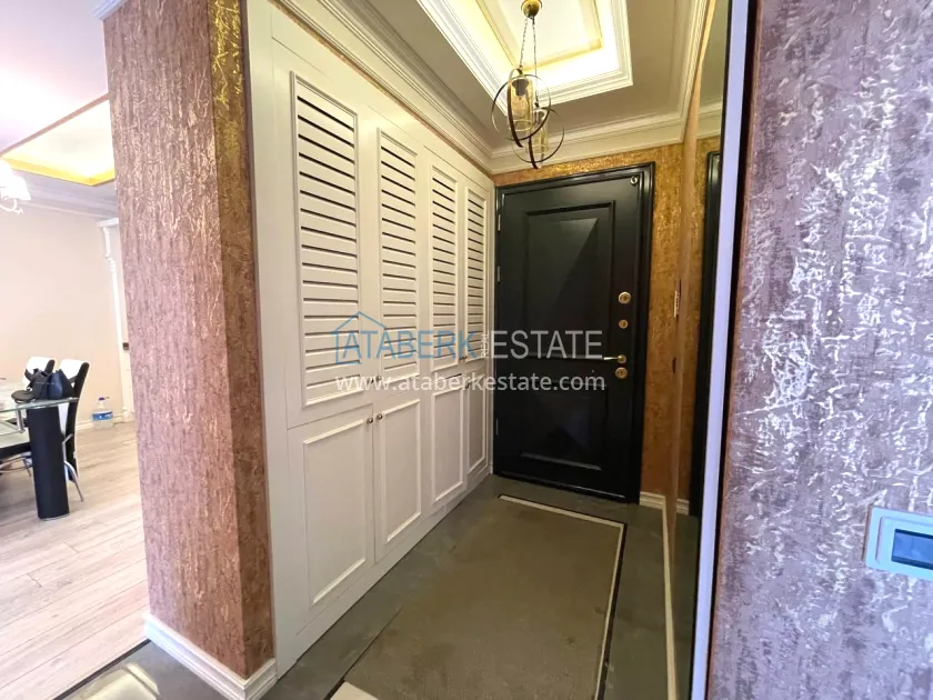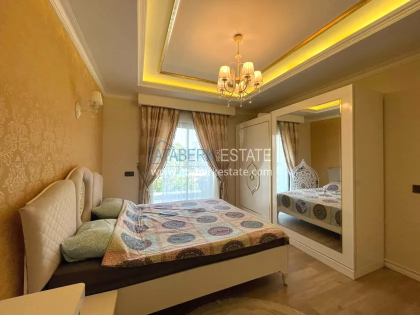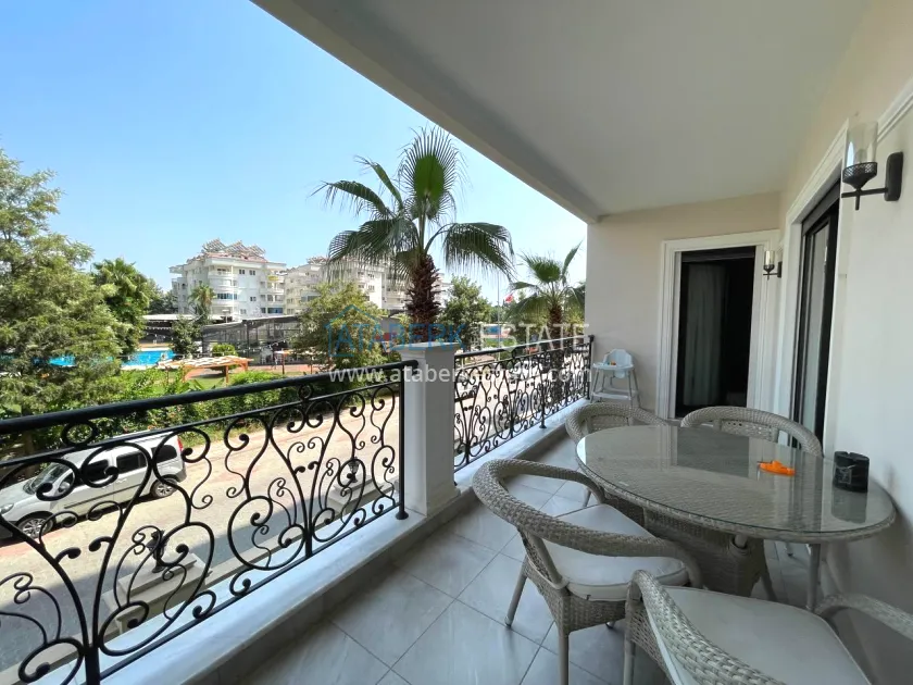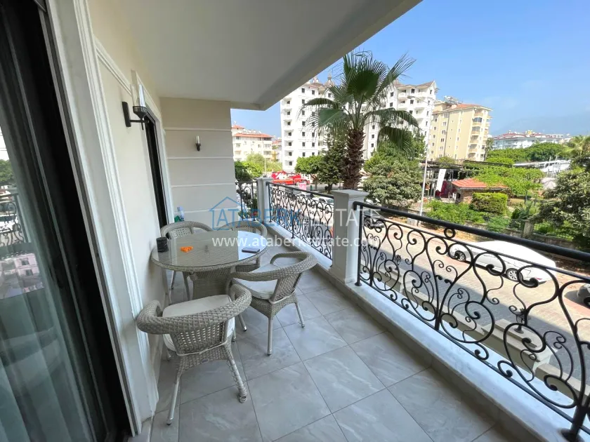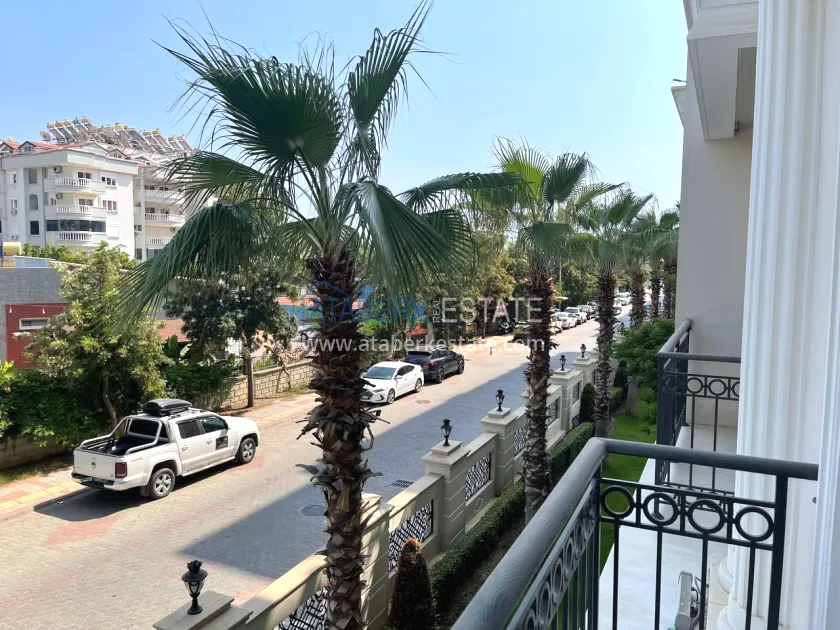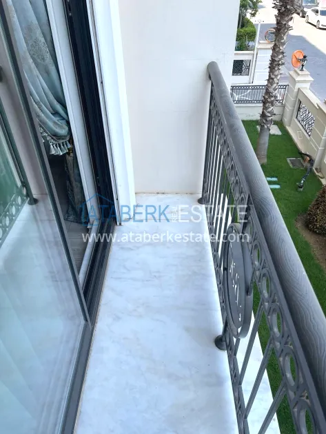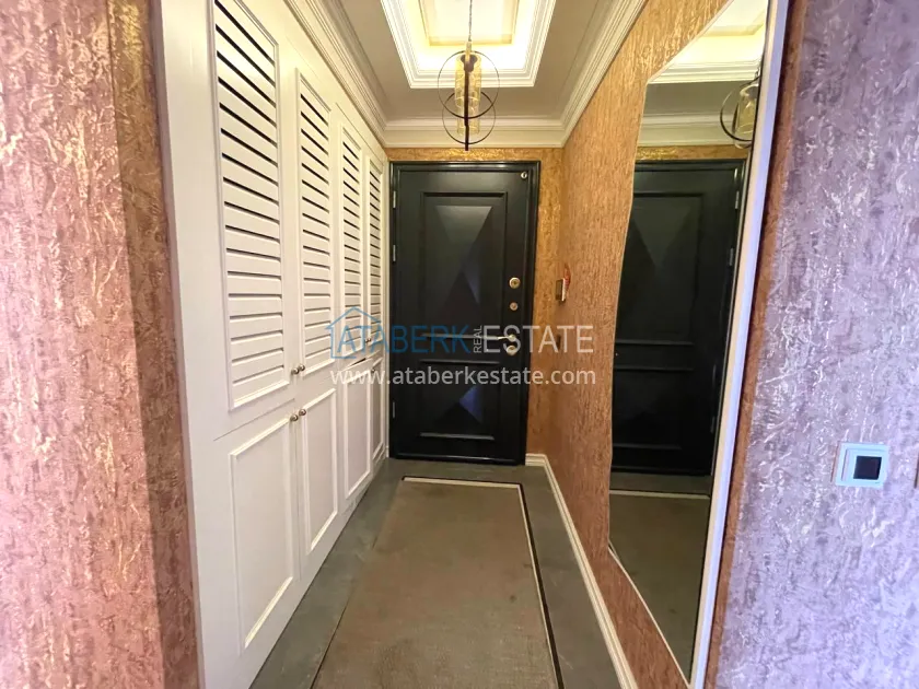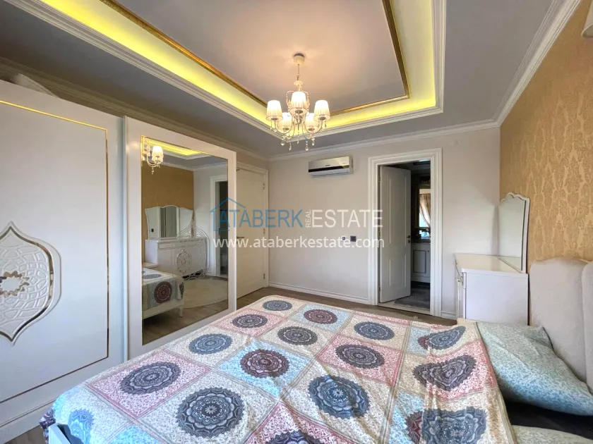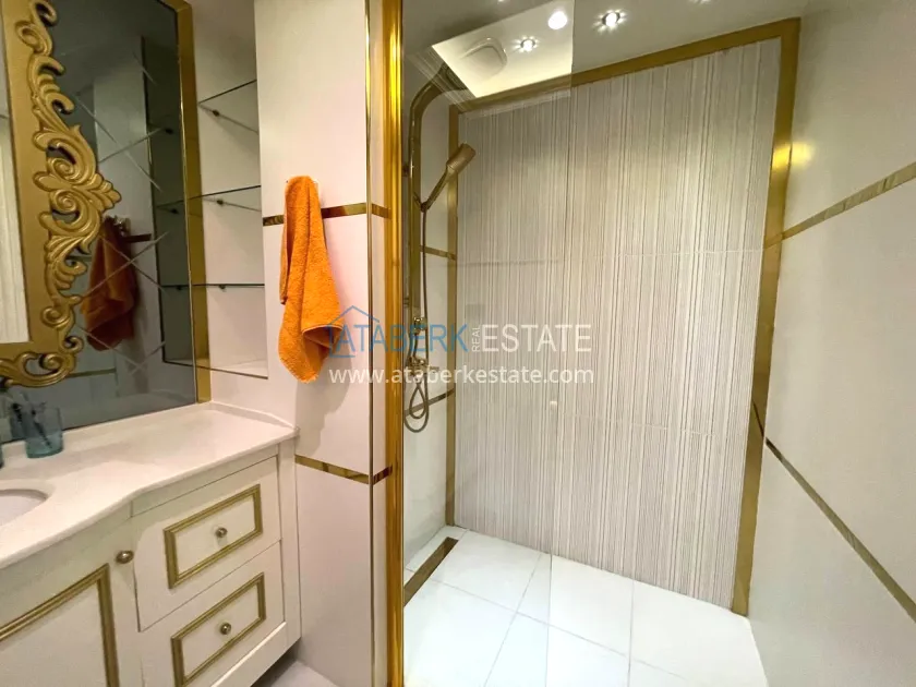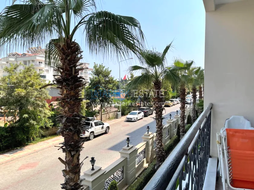 The 110 m² 2+1 apartment is located on the 2nd floor. The layout includes a living room with an open-plan kitchen, two bedrooms, two bathrooms (one in the bedroom, the other is shared), and two balconies — standard and French. The property is offered furnished, with an aesthetic interior, high-quality laminate flooring and ready to move in.
