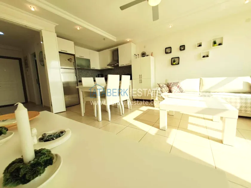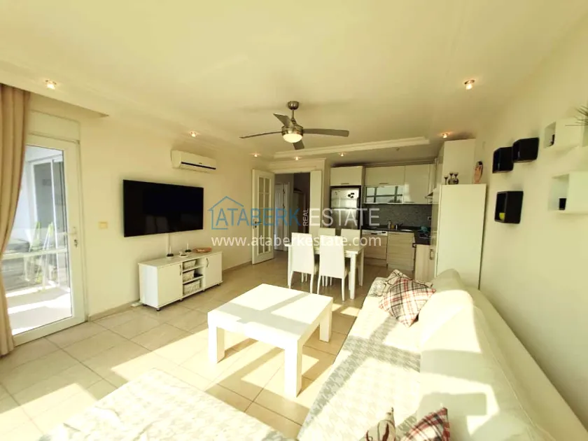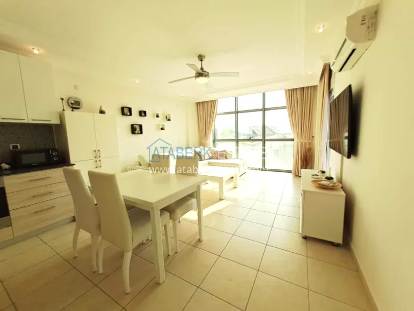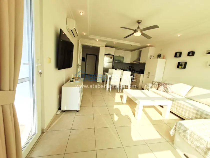 The 65 m² apartment is located on a high ground floor and has a south orientation, so there is always plenty of light and warmth. The 1+1 layout includes a living room with an open-plan kitchen, a bedroom, a bathroom and a balcony. The property is offered for sale with furniture and household appliances, as in the photo, and is fully ready for occupancy.
