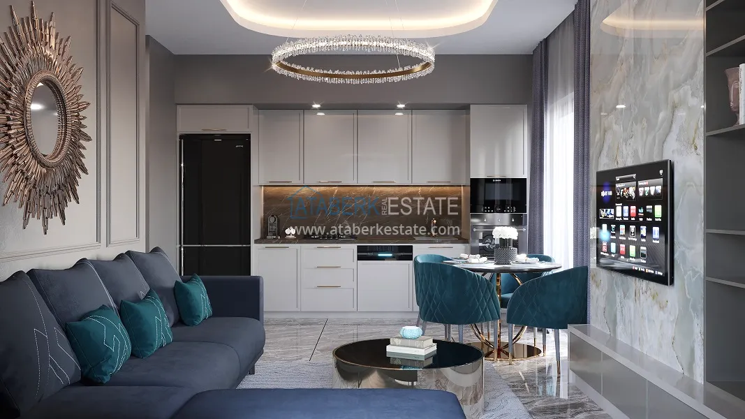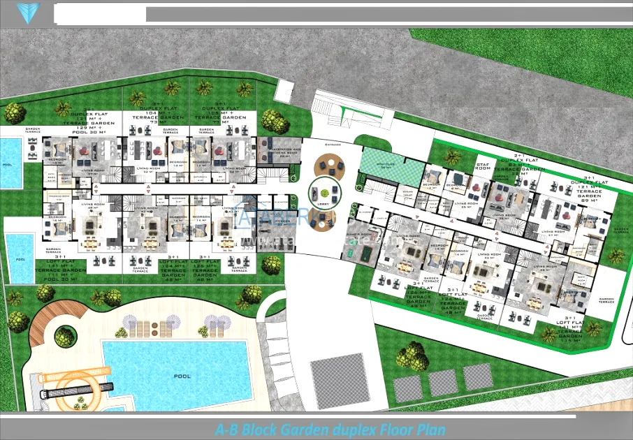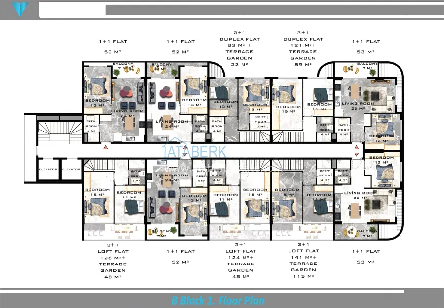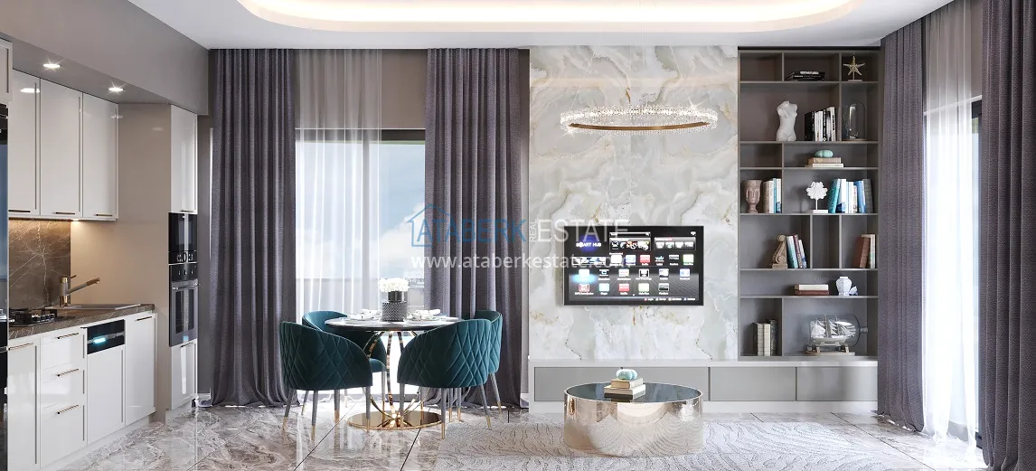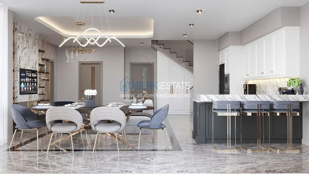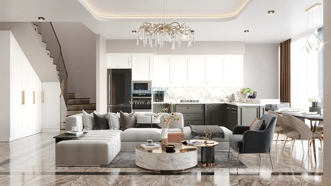 It consists of 2 blocks and an adjacent closed area with comfortable infrastructure. For sale are apartments: duplexes with access to the 3+1 garden, 1+1 two-room layouts and 2+1 penthouses. The price already includes full finishing, cabinet furniture in the kitchen area, and equipped bathrooms.