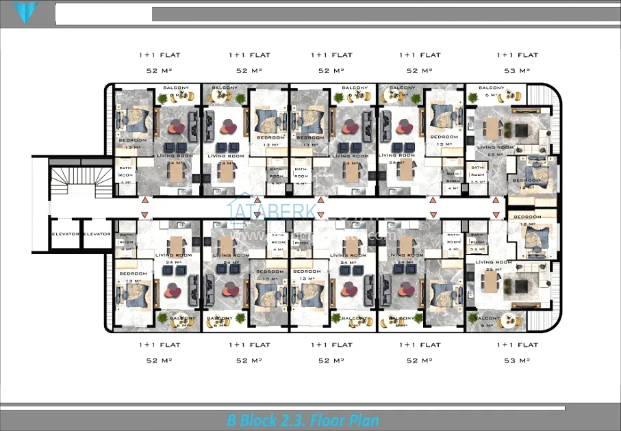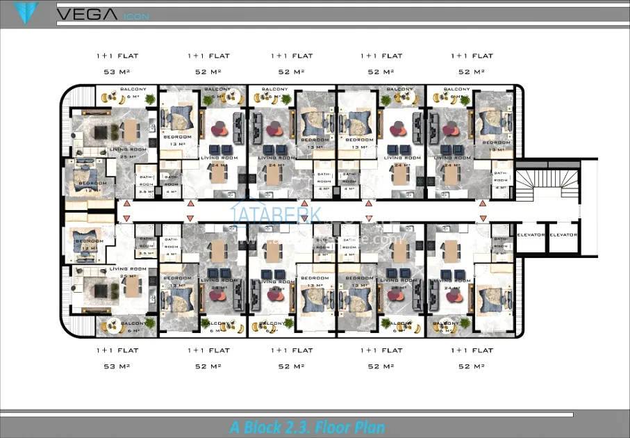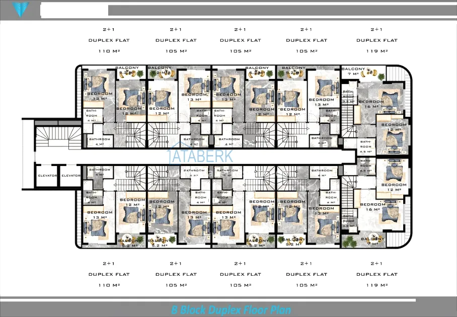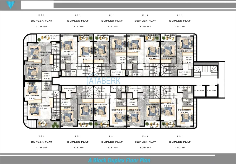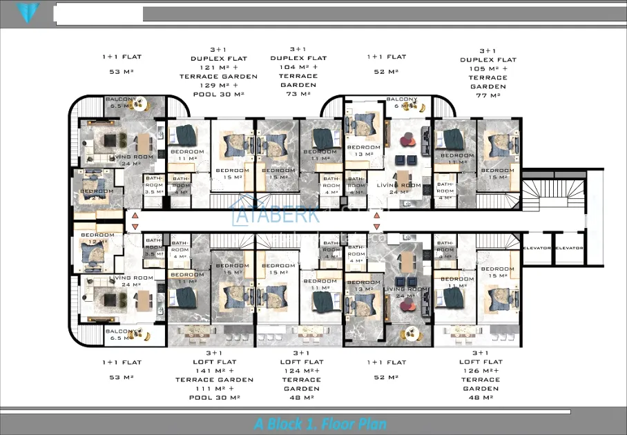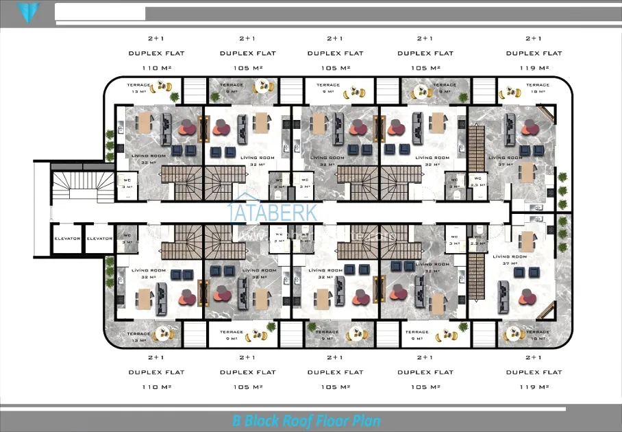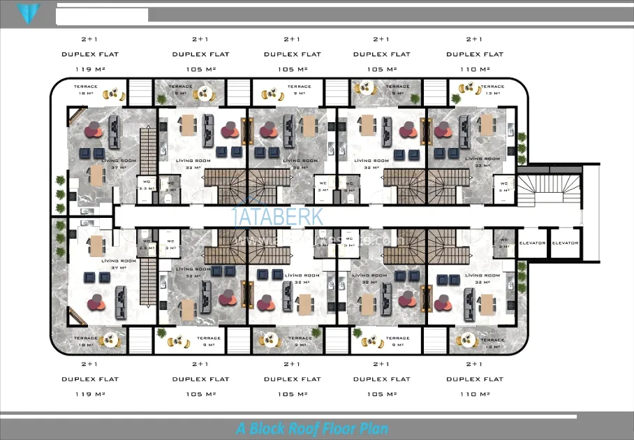It consists of 2 blocks and an adjacent closed area with comfortable infrastructure. For sale are apartments: duplexes with access to the 3+1 garden, 1+1 two-room layouts and 2+1 penthouses. The price already includes full finishing, cabinet furniture in the kitchen area, and equipped bathrooms.