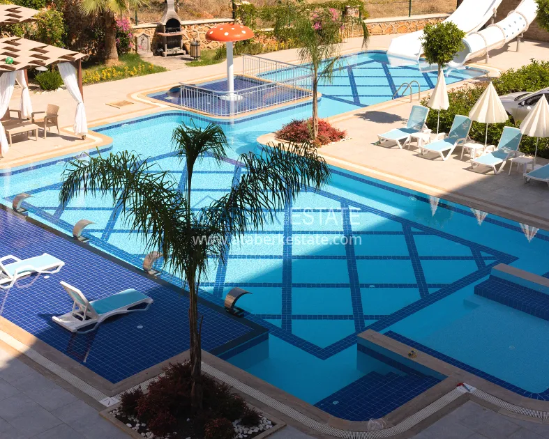The 1+1 layout apartment is located on the 2nd floor and the total area is 55 m2. This square houses: a living room combined with an open-plan kitchen, a bedroom, a bathroom and a balcony with beautiful open views of the mountains and the complex. It is sold in the form in which it is shown in the photo.