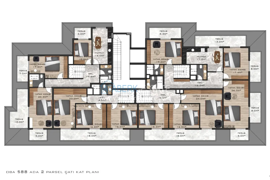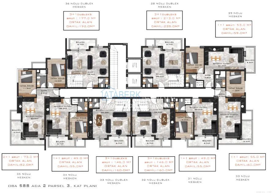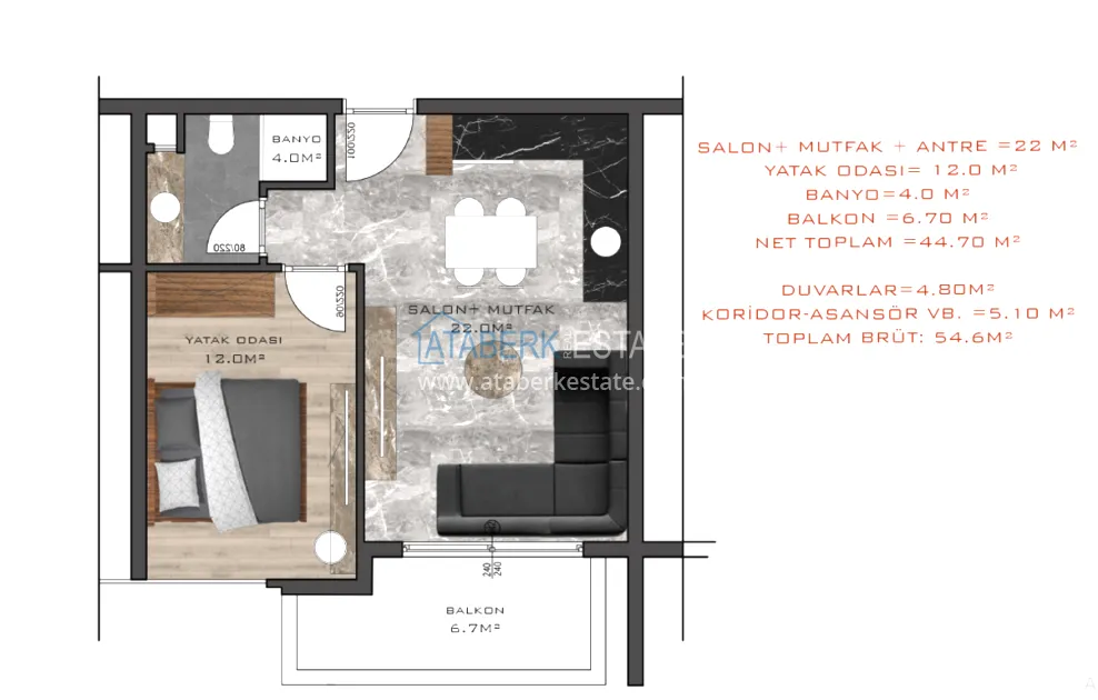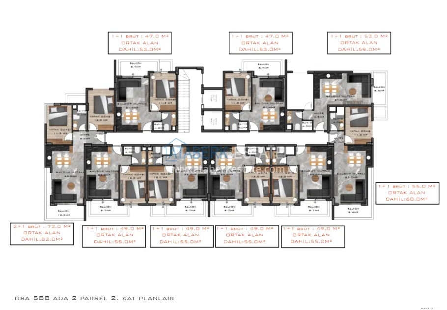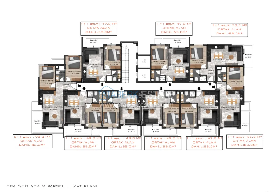 Oba is the central area of Alanya and is only 10 minutes drive from the city center. This is a very cozy area with a wonderful landscaped embankment and low-rise buildings. The residence will be located away from the noisy center, thus providing its residents with the most comfortable and quiet living, at a distance of 1 km from the Mediterranean coast. The location of the complex is attractive because within walking distance there is a complete set of infrastructure from social to household - schools, kindergartens, prestigious colleges, a state hospital, pharmacies, restaurants, cafes, bakeries, shops, shopping centers and supermarkets.