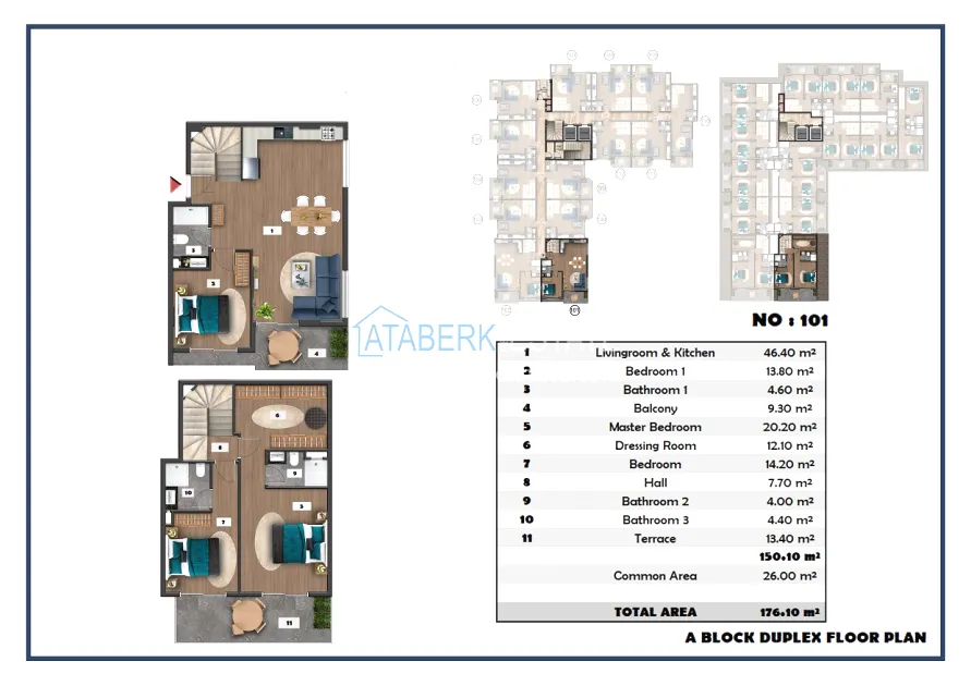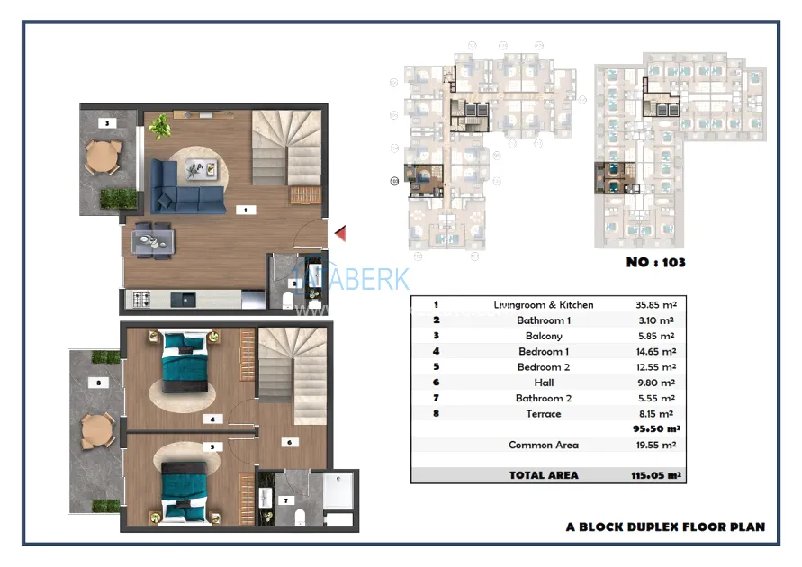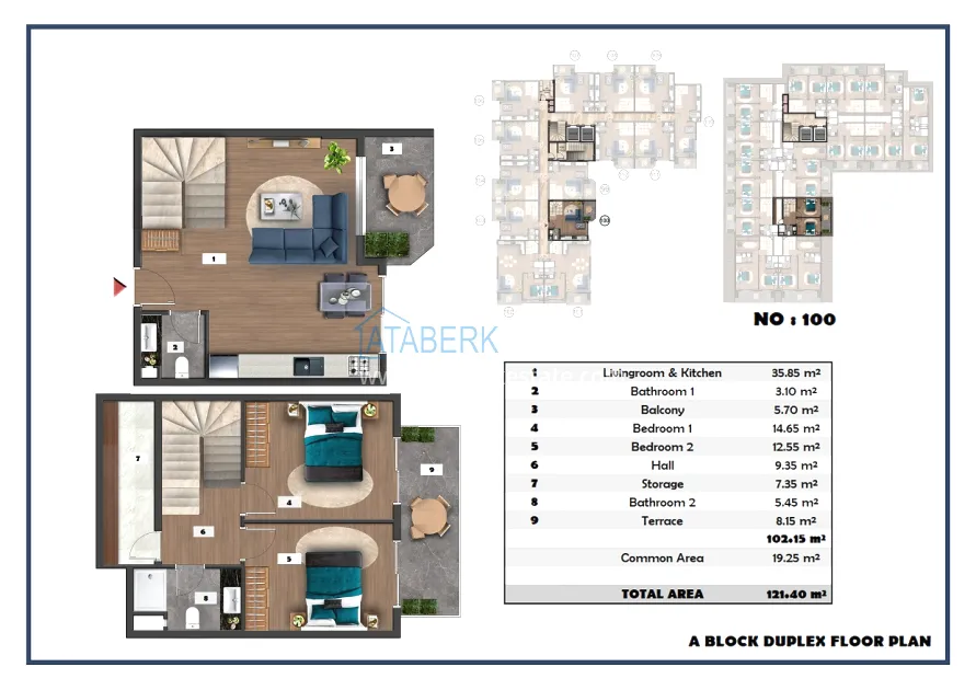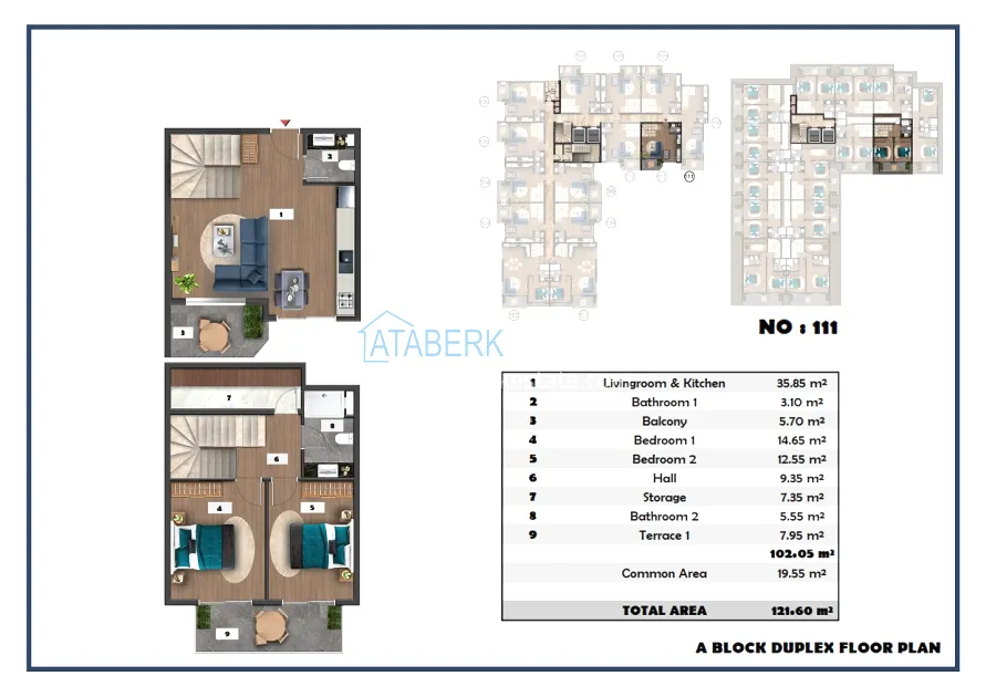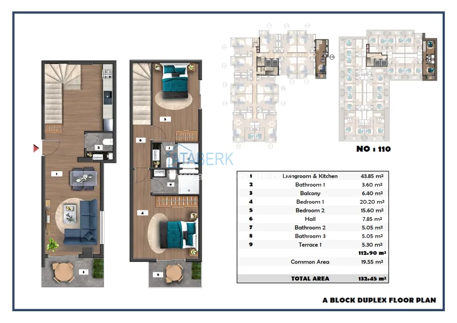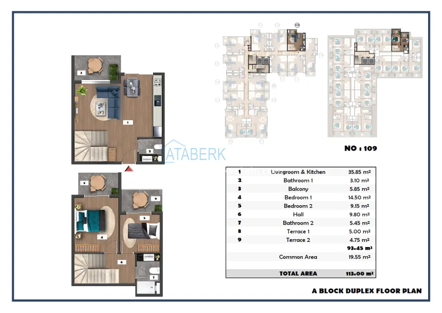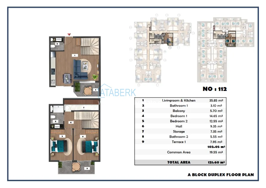 The following layouts are available for sale: 1+1, 2+1 with an area of 97 m2 and 2+1 duplexes ranging from 111.15 to 121 m2. The price already includes high-quality finishing, built-in kitchen furniture, and equipped bathrooms.