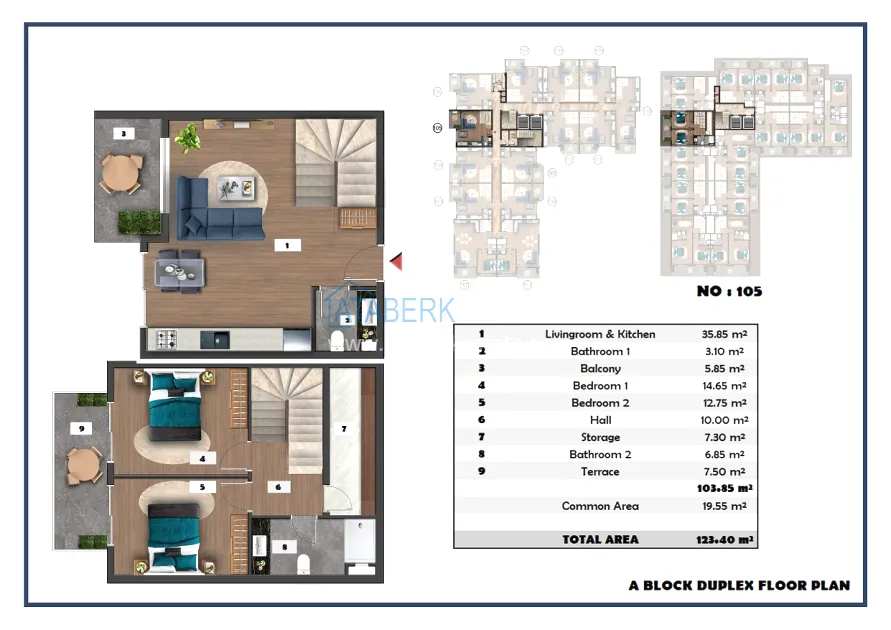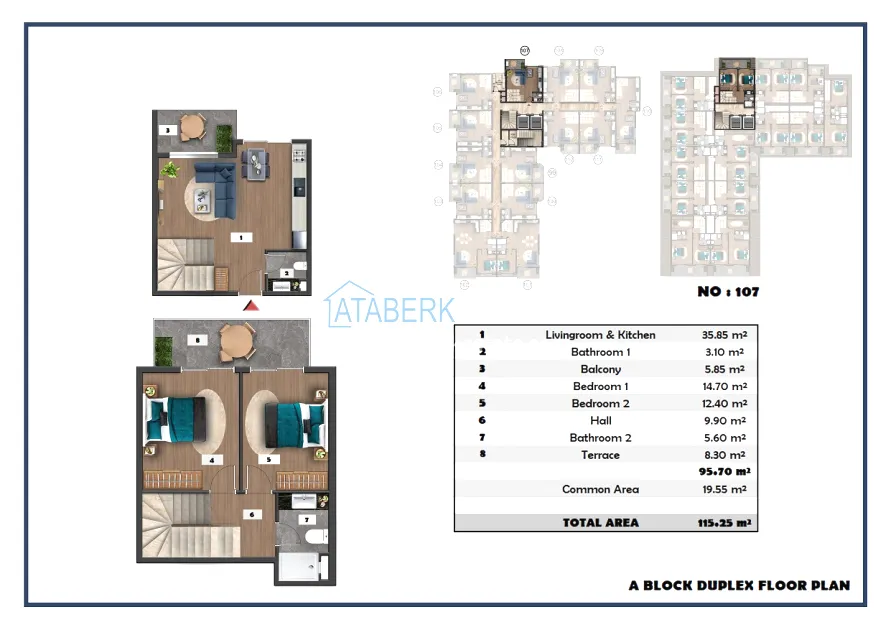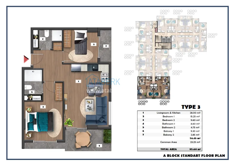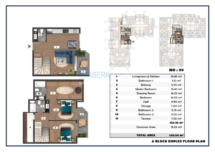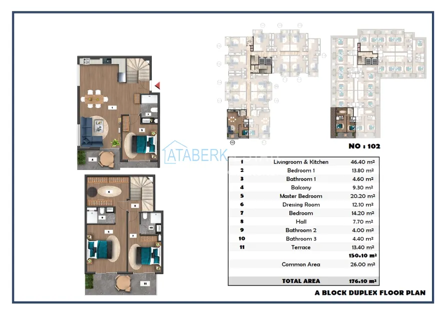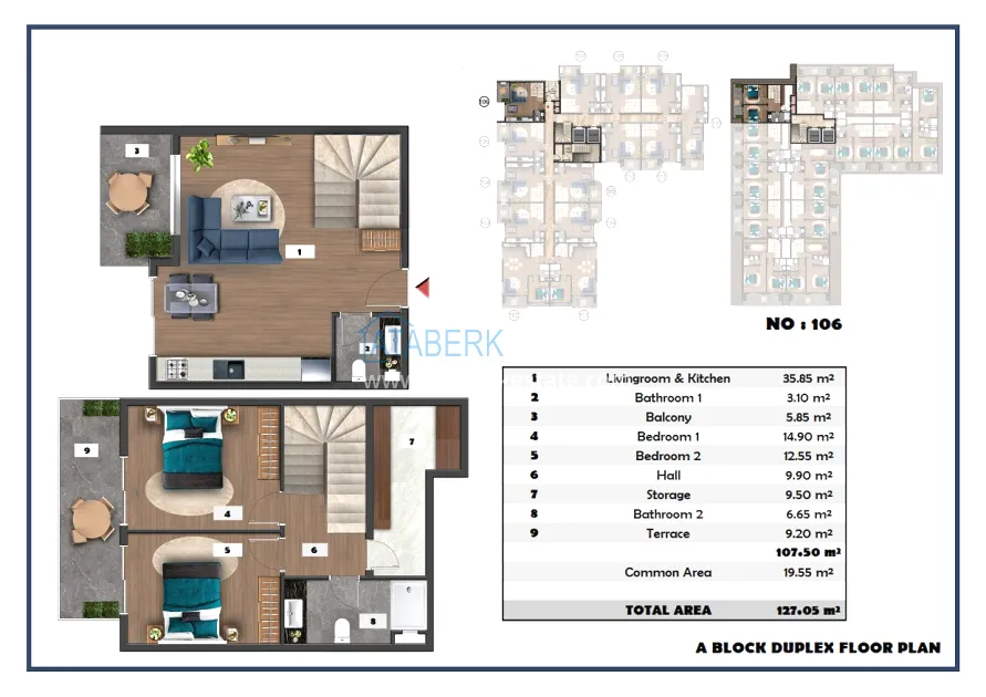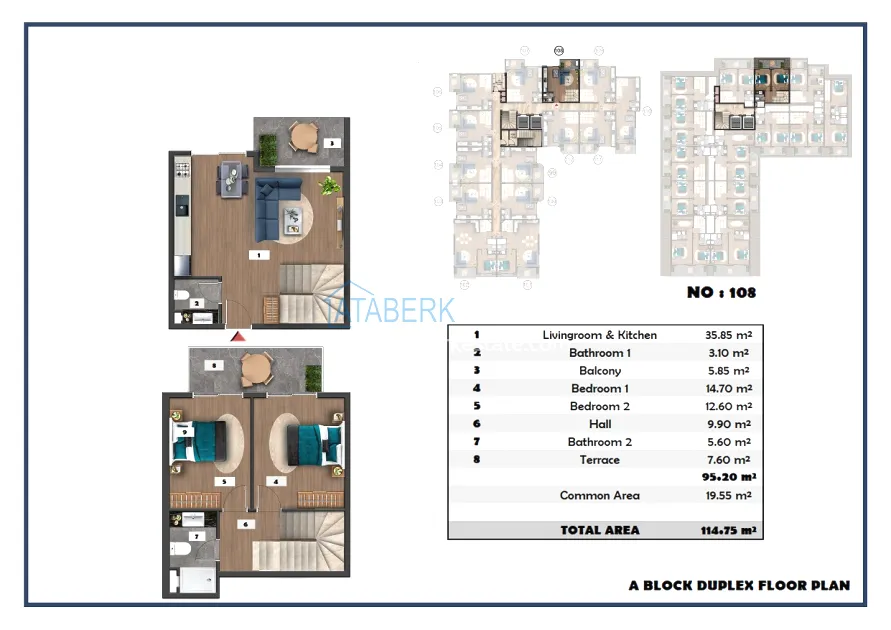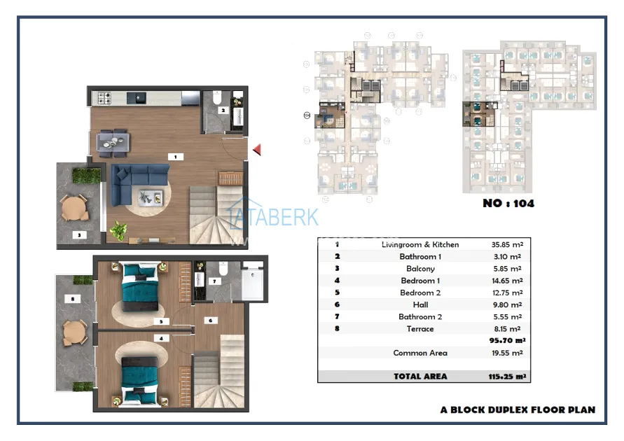 The following layouts are available for sale: 1+1, 2+1 with an area of 97 m2 and 2+1 duplexes ranging from 111.15 to 121 m2. The price already includes high-quality finishing, built-in kitchen furniture, and equipped bathrooms.
