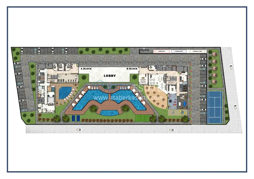 The complex is located on a plot of 8,765 m2 at a distance of 2.2 km from the coastline. It includes two 9-storey blocks with 196 apartments. The residential complex also provides a closed and landscaped area with a self-sufficient range of services for a more comfortable stay.