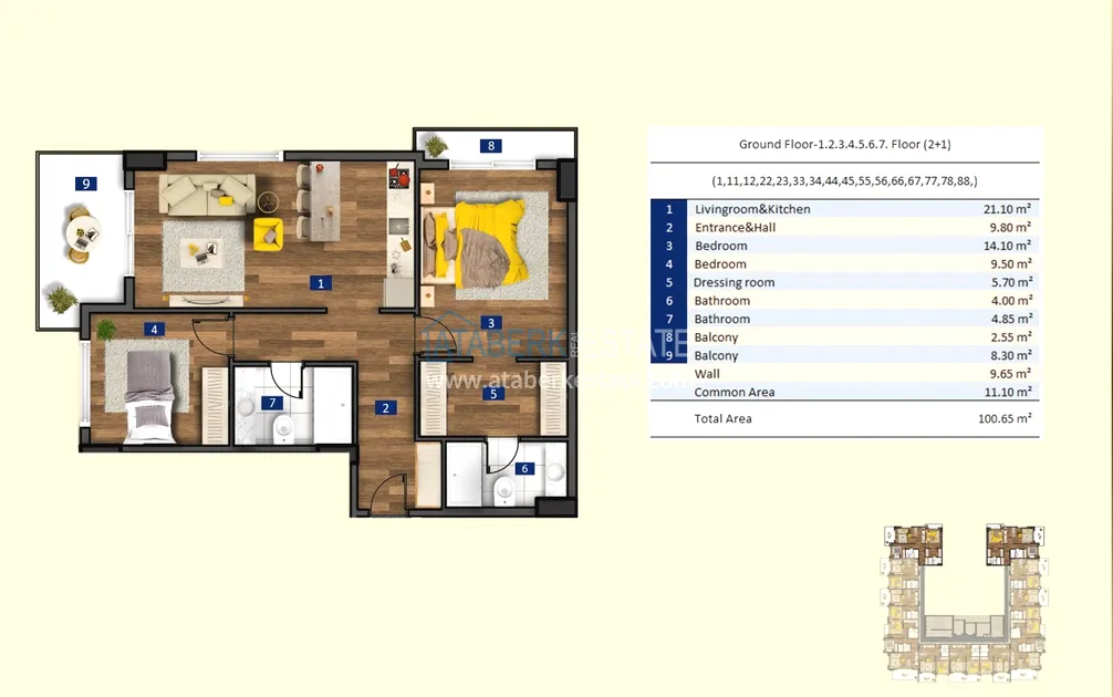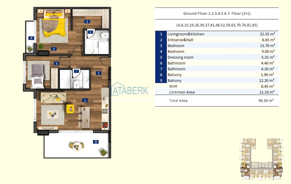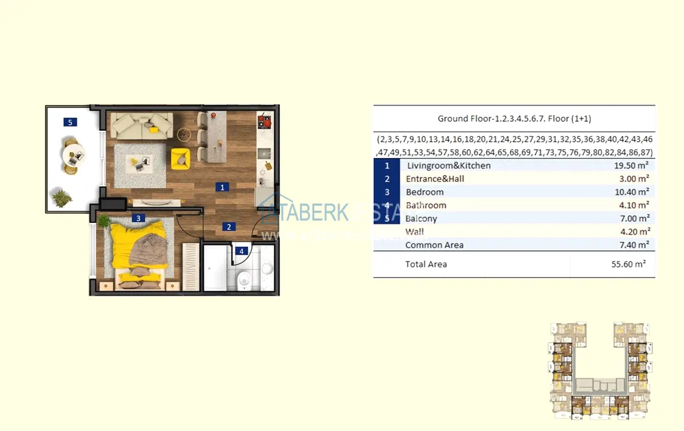 .For sale are 1+1 apartments with an area of 55 and 60 m², 2+1 with an area of 98 and 100 m², as well as two-level penthouses 2+1 and 3+1 with an area of 110 to 200 m². The price includes a complete finishing: built-in kitchen furniture and fully equipped bathrooms. Additionally, a warm floor system and air conditioners are installed, which makes the apartments ready for comfortable living at any time