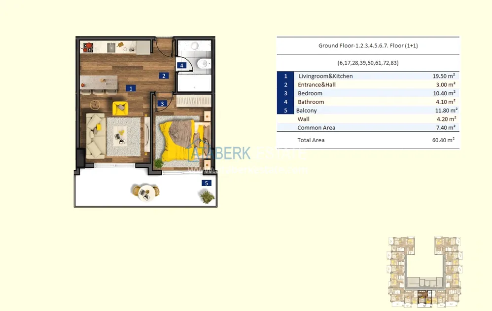 The residence was built on a plot of 3,500 m² just 200 meters from the Mediterranean coast - on the second coastline. The comfort-class complex consists of one block of 99 apartments with a protected area and self-sufficient internal infrastructure. The project is in the final stages of completion and is suitable for short-term rentals, which expands the options for using real estate