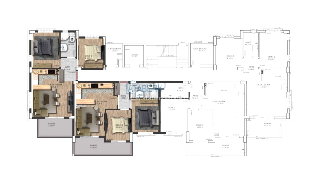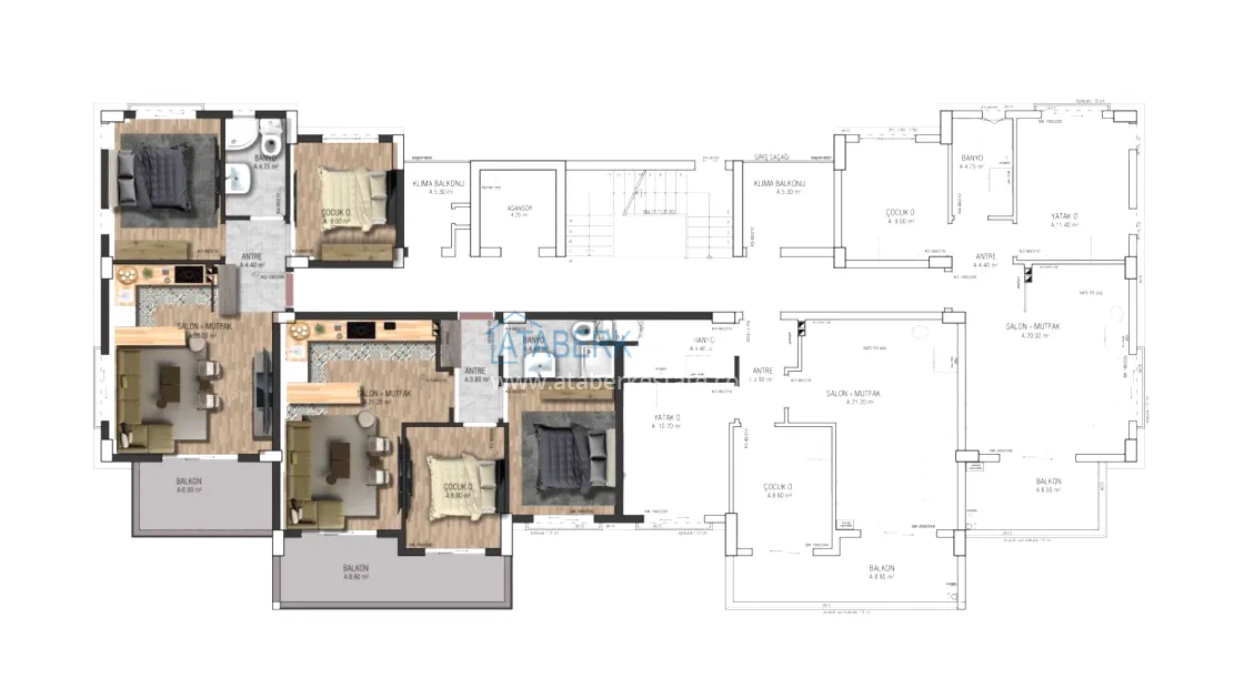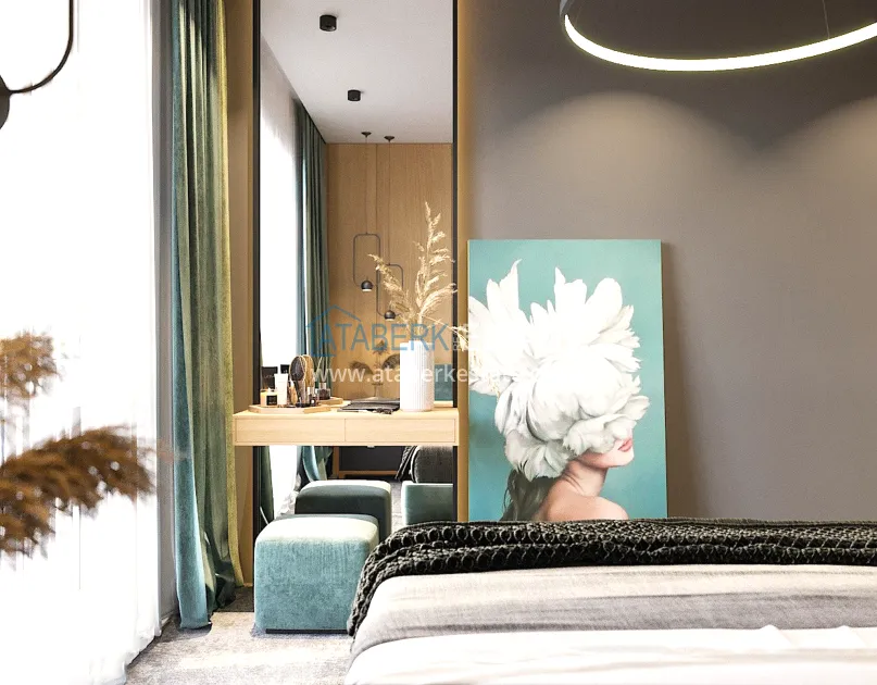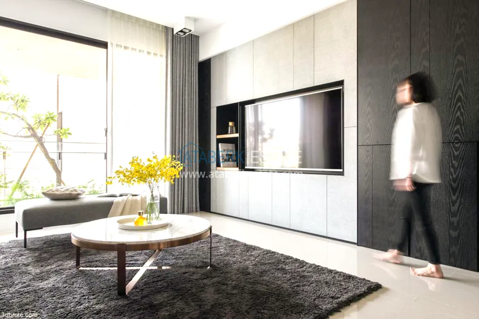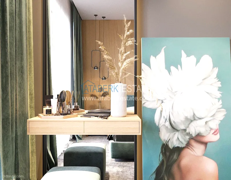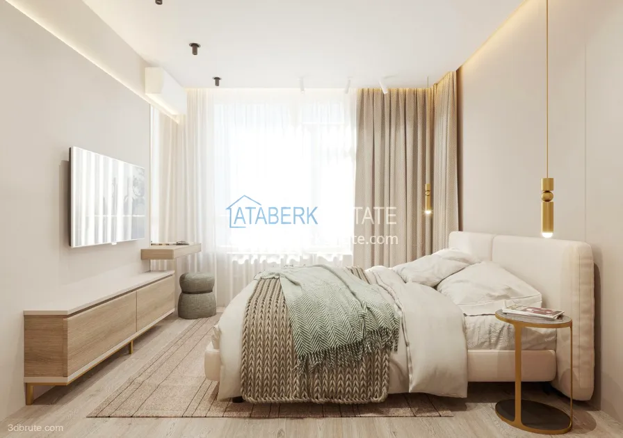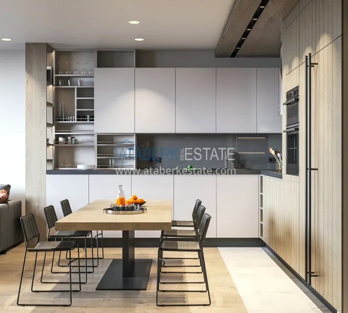 In this project, 2+1 apartments with an area of 85 m2 are available for sale: a salon, an American-style kitchen, two bedrooms, one combined bathroom and one balcony. The ceiling height is 2.90 m. Technical characteristics of the apartments: AGT laminate 8 mm; Kütahya ceramic tiles (60x120 cm); Bathrooms are equipped with Vitra plumbing; Ferre kitchen and bathroom furniture; AGT kitchen and bathroom furniture; Individually painted lacquered doors; Heat-insulating glass; Electric blinds; Wires and cables from reliable brands Hes and Öznur; Interior lighting with double aluminum spotlights.