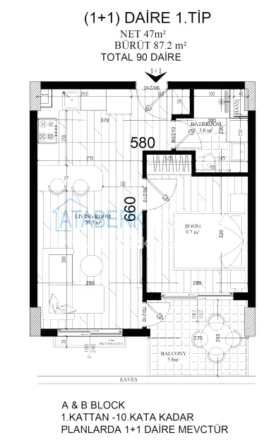 This modern residential complex was created by a major developer designed by leading Turkish architects. Its appearance resembles the silhouette of a sea liner, which makes the building stand out from others. On an area of 10,720 m², there is one 12-storey block with a closed protected area and a developed infrastructure for recreation and life. Energy-saving technologies were used during construction: solar panels, noise and waterproofing systems, and central gas heating. The complex fully complies with modern seismic resistance standards, which guarantees safety and durability.