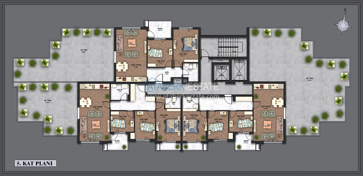 The complex is located in a rapidly developing and actively developing area of Antalya. The area is located near the airport, the city's largest shopping centers and Lara's beaches. The residence consists of one 6-storey building and a private protected area, and the self-sufficient infrastructure will make living truly pleasant and comfortable.
