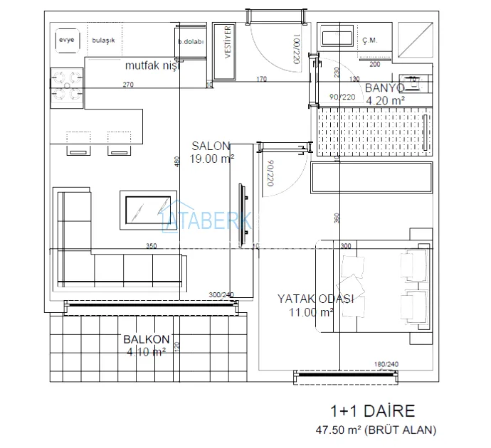 The construction is carried out by a large construction company with extensive experience. The land area is 15,384 m2. The project has one large block of unique design, as well as a rich external and internal infrastructure. The residential complex will be located in the Altintash district, which is located in the eastern part of the city, near the Lara district and Antalya Airport. Now it is actively developing and being built up. The complex is 6 km from the beautiful beaches of Lara, and 6.5 km from the center of Lara, just 10 minutes by car. It is home to large shopping centers, shops, banks, restaurants, parks and various attractions. Large shopping centers, such as Deepo, Mall of Antalya, İkea, are located in the upper part of the complex, 5 km from the complex.