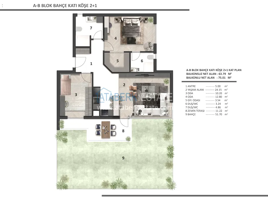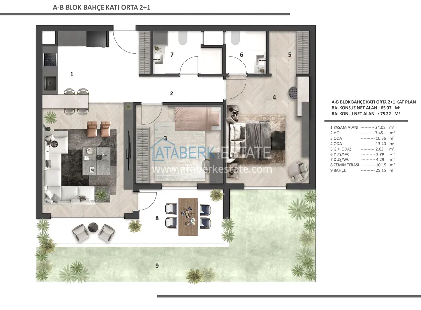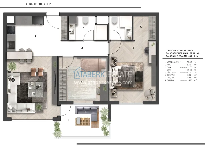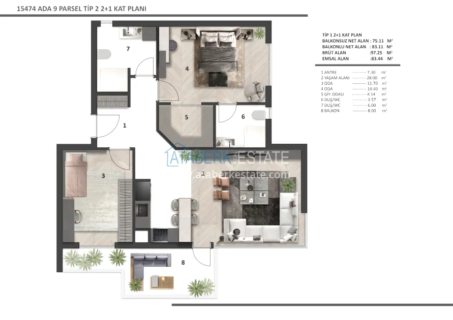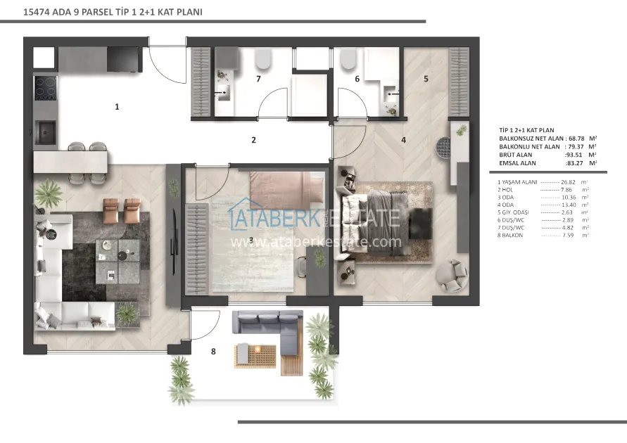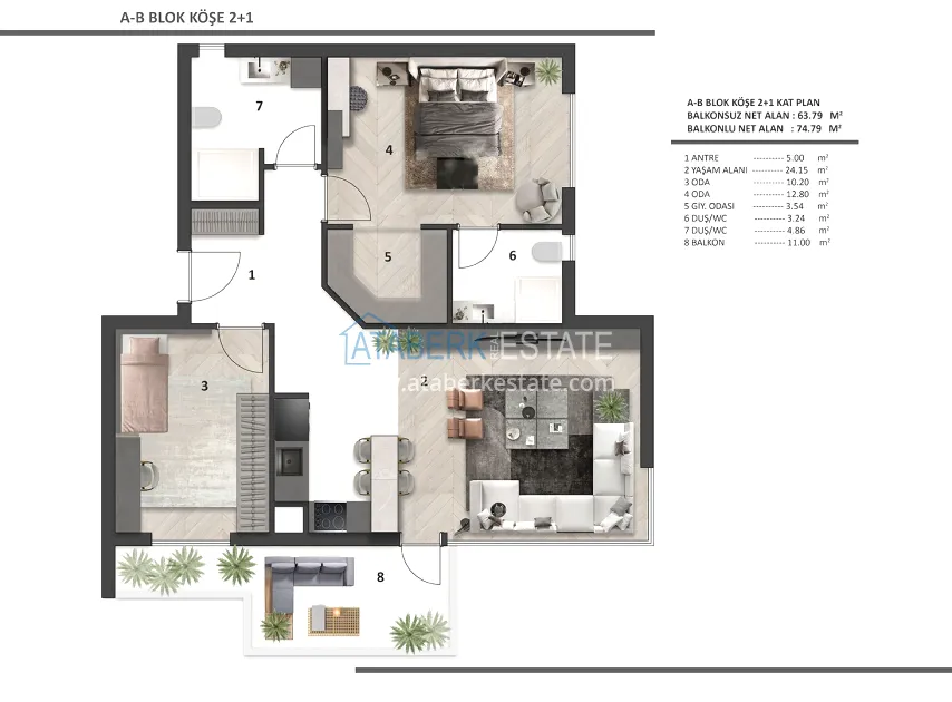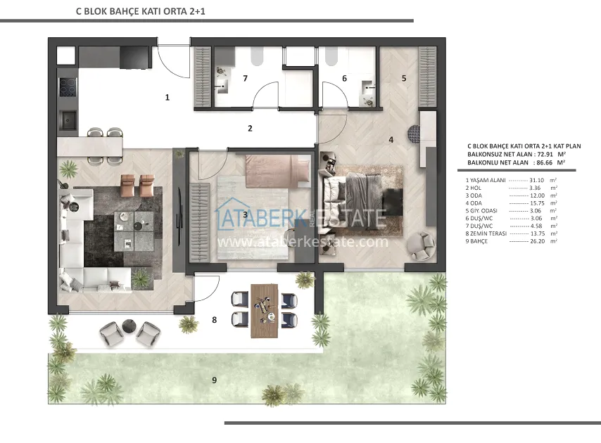 Each apartment has a clean ceiling height of 2.80 m, REHAU underfloor heating, 8 mm Floorpan laminate, Çanakkale Seramik ceramics, Kalde soundproof pipes, Kale plumbing, AGT furniture, Viko electrics, lacquered interior doors with Hafele fittings. The kitchen area is equipped with a built-in Siemens set, appliances (3 pieces) and a Belenco quartz countertop. A Daikin multisplit air conditioning system was installed, the front door was made of FALEZ steel. The balconies are equipped with tempered glass and aluminum railings. Materials from well-known manufacturers with a high reputation were used in the decoration.