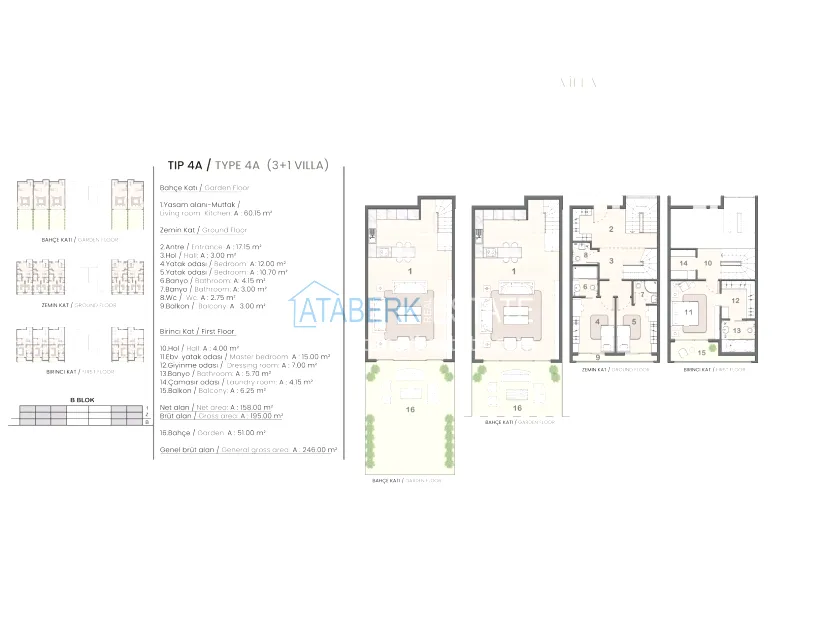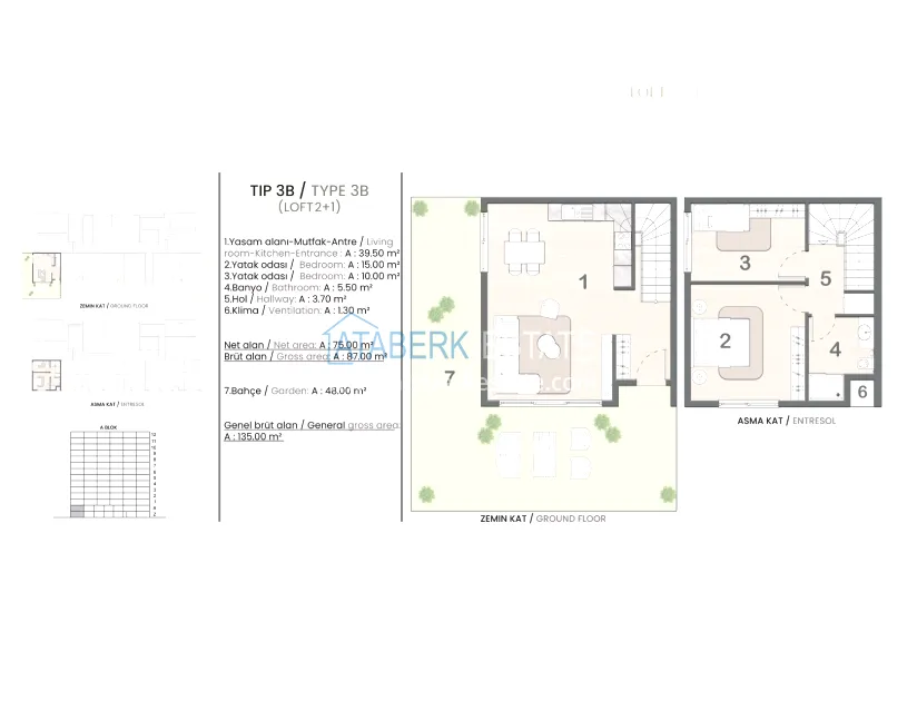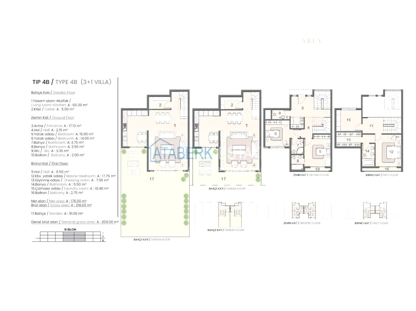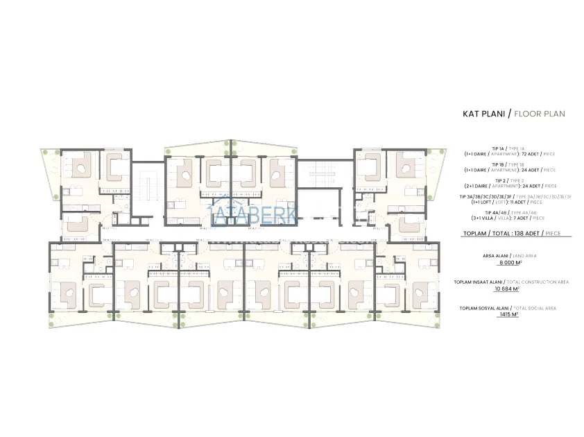 The complex is being built on an 8,000 m² plot of land. The total building area will be 10.684 m², of which 1.415 m² are allocated for social infrastructure. It will include one residential block with 138 apartments and 8 adjacent villas. You can choose from 1+1 apartments ranging from 70 m² and 2+1 with an area of 85 m², as well as spacious villas from 195 m². Each apartment is delivered with a well-thought-out finishing: a steel front door, a built-in wardrobe in the hallway area, equipped bathrooms, a built-in kitchen with a stove and an extractor, electric shutters, and air conditioning outlets. The photo shows the showroom.