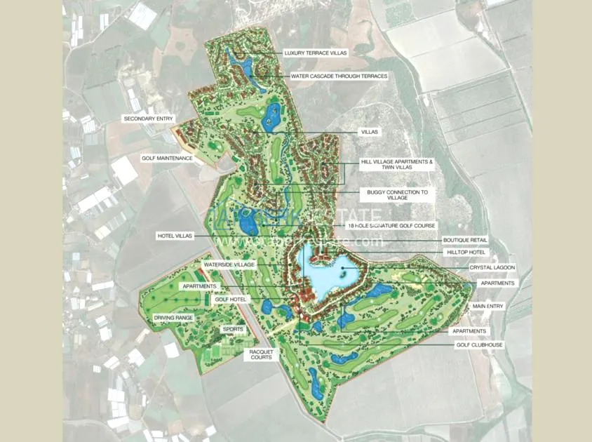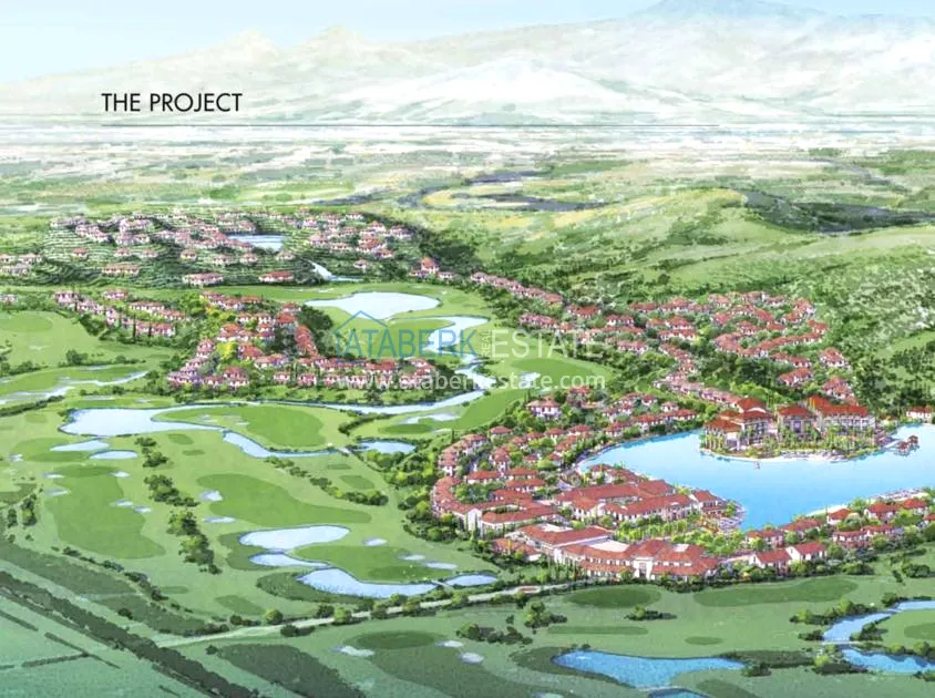 Территория земельного участка занимает 135 Га, общая площадь застройки 165 000 кв.м. План проекта включает: 338 квартир от 60 до 130 кв.м., 75 таунхаусов от 145 до 155 кв.м., смежные вилл от 175 до 200 кв.м., 165 вилл от 200 до 1300 кв.м., бутик отель 14 люксов и 28 вилл, спортивно-оздоровительный центр, торговая деревня, гольф и спорт клуб, клуб резидентов, пляжный клуб, бассейны и лагуны, спортплощадки (теннисный корт, баскетбольная площадка, футбольное поле), поле для гольфа на 18 лунок.